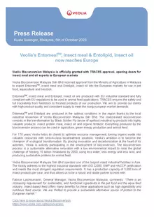 Veolia Bioconversion Malaysia Sdn Bhd received approval from the Ministry of Agriculture in Malaysia to export Entomeal®, insect meal and Entolipid, insect oil into the European markets for use in pet food, aquaculture and livestock.